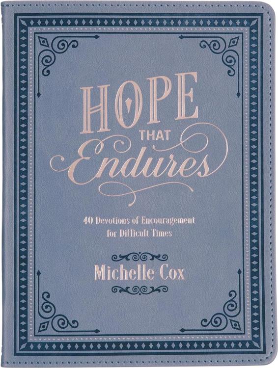 In the powerful Hope That Endures Blue Faux Leather Devotional, Michelle Cox shares lessons and truths she has learned about God’s faithfulness. These insights come from both her friends’ difficulties and her own tragic experiences. She needed God’s hope to bear numerous challenges: her father’s suicide, a car wreck, her son’s life-threatening illness, financial difficulties, and the loss of part of her hearing and eyesight. Michelle sometimes felt overwhelmed, barely able to take another breath. Yet, even as her world was shattered and rocked, she discovered that the Rock of Ages — Jesus — was all she needed.