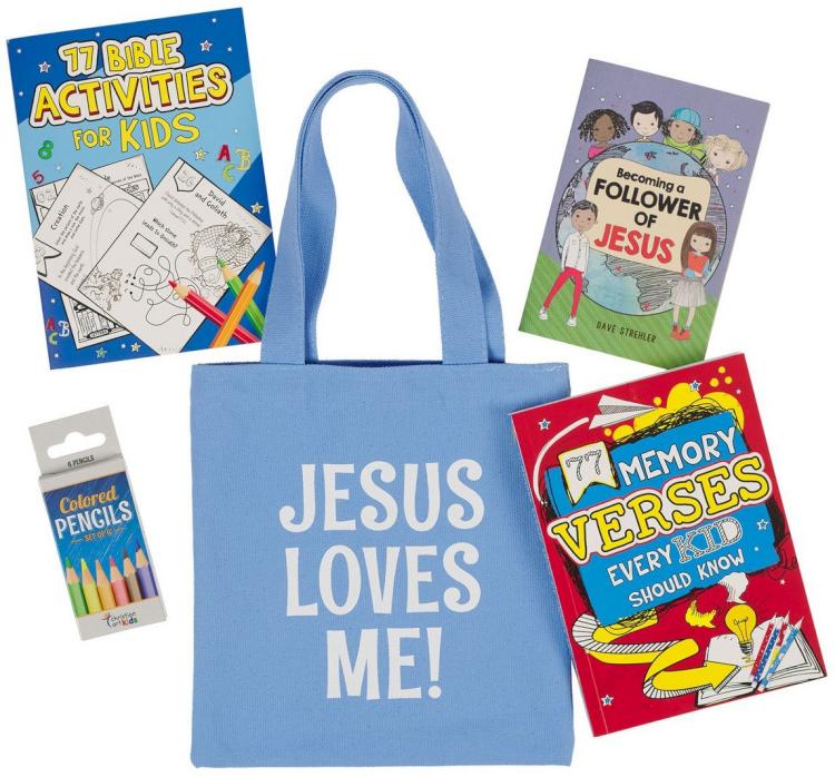 The Blue Jesus Loves Me Church Activity Kit for Kids can be given to children as they enter the sanctuary, sent home as a weekday spiritual activity, given as welcome packs at VBS, or kept in Sunday school classrooms to use when a teacher is absent.