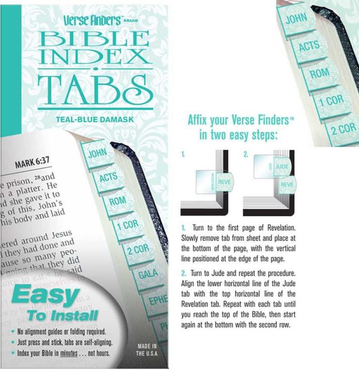 Perfect for those carry their Bible with a sense of style. Floral background pattern with white edges are a visually pleasing way to find favorite Scriptures. 84 white foil-edged tabs for Bible from 7 inches up to 12 inches. Set includes: Old and New Testament tabs, Catholic tabs, special notation tabs and a Life Verse tab.