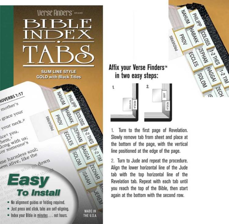Features: Easy to install – no alignment guides or folding required. Just press and stick. Tabs are self-aligning. Index your Bible in minutes…not hours. Attractive and durable for years of trouble-free use. Horizontal style – reads left to right. Compact 3/8″ design indexes a standard Bible in only 2 rows, making books easier to find.